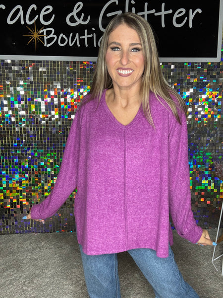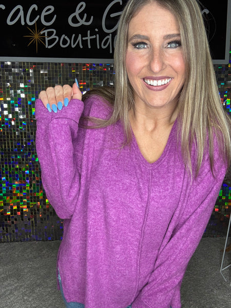 If you need a super Duper soft, super duper gorgeous colored long sleeve/lightweight sweater then we got this just for you! It has lots of stretch and is a relaxed fit. This purple is perfect for fall!