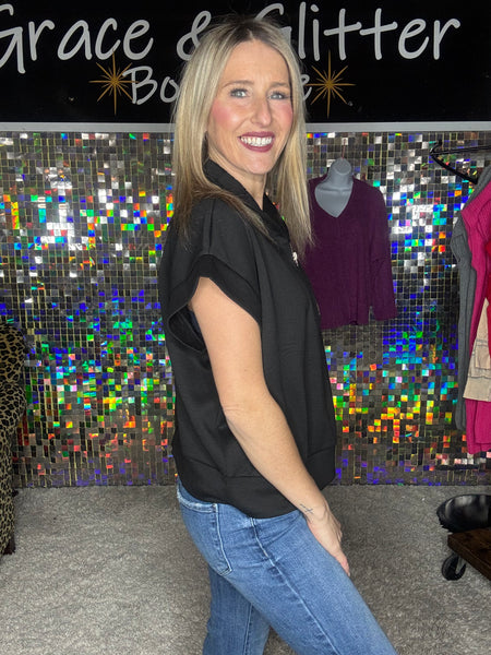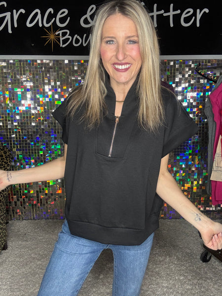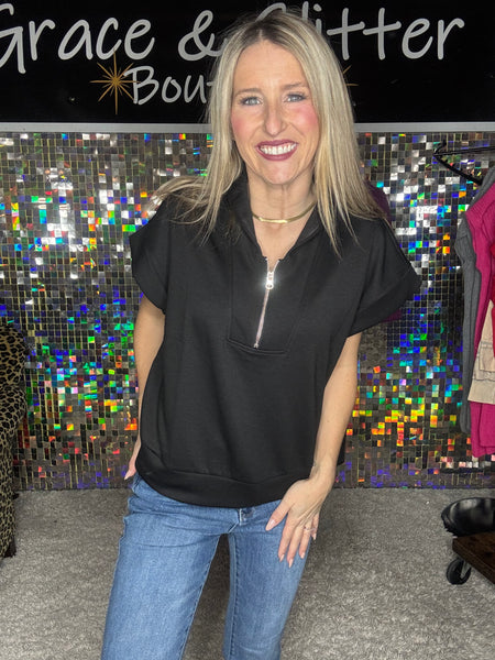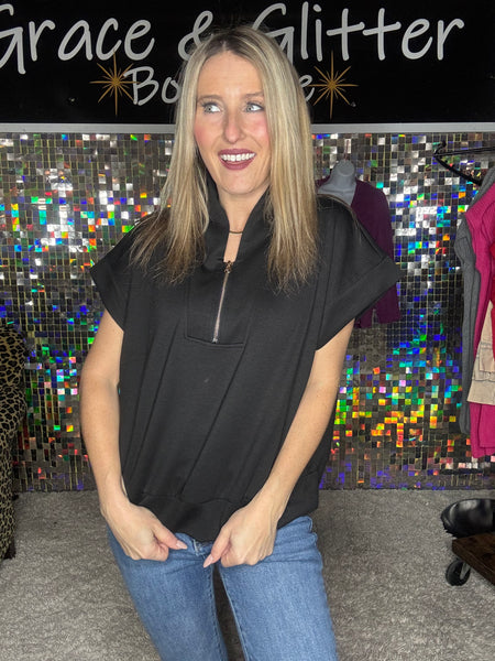 The scuba tops are definitely a trendy thing right now and you will 100% not regret buying them. They are so so soft and smooth feeling almost like silk but thicker than silk. You can fold the collar down if you want. It also has a gold zipper in the front. These tops are roomy, but they do fit true to size.