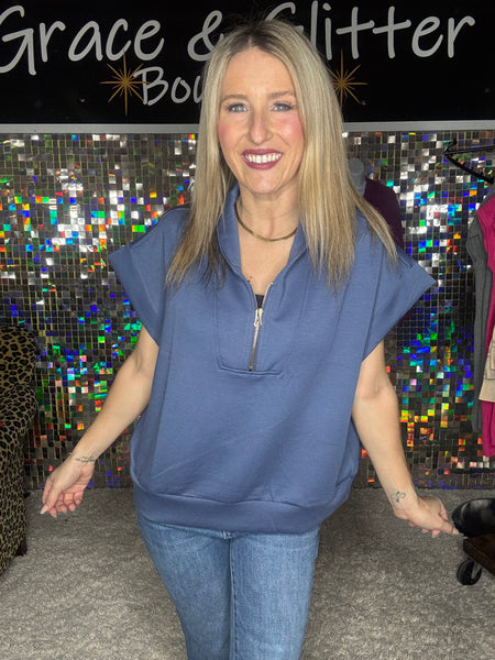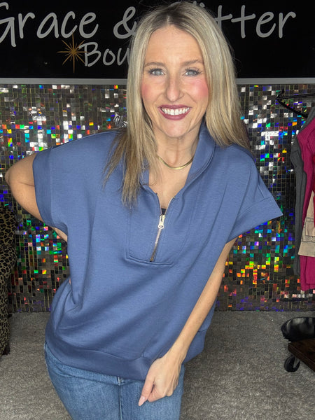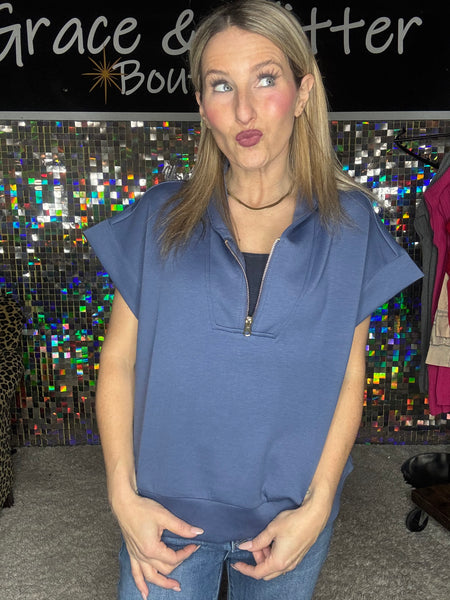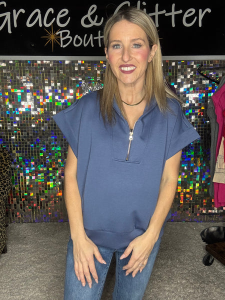 The scuba tops are definitely a trendy thing right now and you will 100% not regret buying them. They are so so soft and smooth feeling almost like silk but thicker than silk. You can fold the collar down if you want. It also has a gold zipper in the front. These tops are roomy, but they do fit true to size.