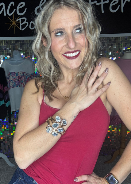 Make a statement with this large gold clasp bracelet that features a fun design and 6 large silver stones.