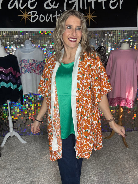 Are you the type of person who gets warm easily but still likes to wear cardigans or kimonos? Well, check out those short sleeve lightweight, super soft kimono. It has an orange floral pattern with a pop of green. Perfect to pair with our ‘it isn’t always Greener top!’