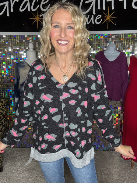 This sweater is sooo cute! It is thicker and soft. It is black with gray and hot pink cheetah spots. It has a v neck and the bottom has gray around the bottom! It fits more boxey. It has lots of stretch but due to the length, I don’t think a 2X could fit into the XL!