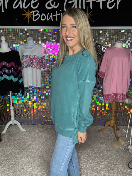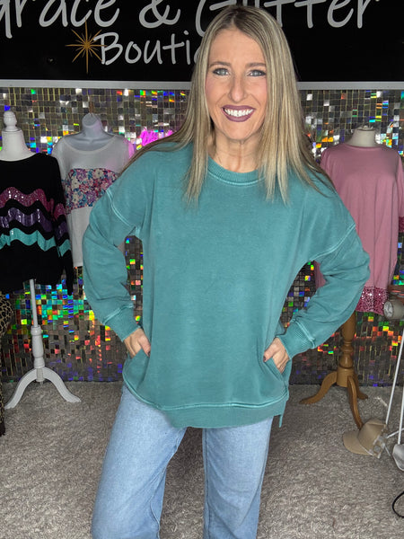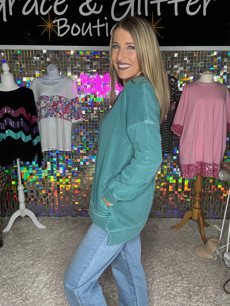 Oooo this sweater is a MUST! It is a high low fit (so longer in the back). It is so comfy and so soft. Fits true to size with a relaxed fit. This sweater has front pockets, which makes it a must to purchase. You cannot go wrong with it!