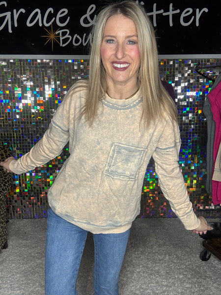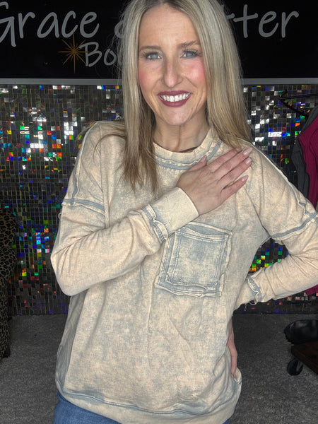LOVE LOVE LOVE this acid wash sleet top. It is PERFECTION!!!!! It has a front pocket. The color is different BUT IN A GOOD WAY! I love it. Top fits true to size but with a relaxed fit. It also has pockets!!!!